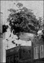 Above Left: Sedro-Woolley Laundry and Dry Cleaners was at the northwest corner of State and Murdock streets and the chimney dominated the downtown district. It burned in 1965 and eventually the whole row of early-20th century buildings were razed for parking, including the original Opera House/Moose Hall. We still hope that a reader will have interior photos of the laundry or photos during the fire and the rubble that remained of the buildings. For instance, did the auto parts store and the old Moose Hall/Opera House burn too? Or did they survive and were they razed sometime after the fire? Above Right: This is a photo of the hanging baskets that we mentioned. So we know that the tradition started more than 60 years ago. |