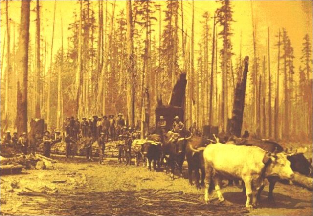 We unfortunately have never found a photo of Bradsberry or his logging camps. But this one from Jesse B. Ball's camp in Sterling will certainly illustrate what logging was like when Frank arrived in 1884 and soon went to work for Ball. Oxen were used for logging then and fetched as much as $2,000 for a yoke, at least well into the hundreds. Many of the best logs along the shore of the Skagit river had been felled already, so camps were moving inland. The raw logs, some 70 feet long and longer, needed to be dragged to the river shore where they could be rafted downriver or pulled by sternwheeler steamboats, such as the Black Prince. When the distances were too far or when they wanted more speed, loggers would switch to horses. All this meant a large market for feed for the animals of burden, so agriculture in the county grew along with logging. We hope a reader can share a scan or copy of the family or logging photos that will help illustrate this article and others. |