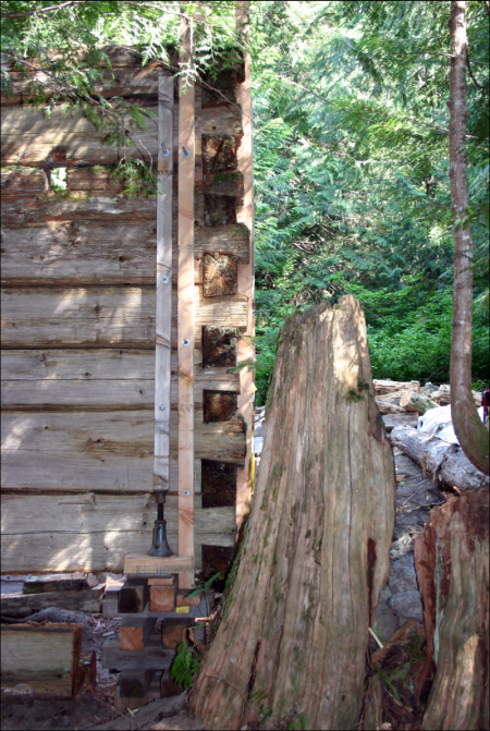 The photo on the left shows John Platz illustrating during the 2006 renovation how the corners of the cabin are stabilized by the use of cribbing and other means. The frequent rain and snow storms cause constant erosion in the winter months, which washes away soil and rocks that originally formed a level bed for the cabin. The photo belows shows a modern jack used to raise another corner, this one where the huge bottom planks were removed because of having been rotted to the core. |