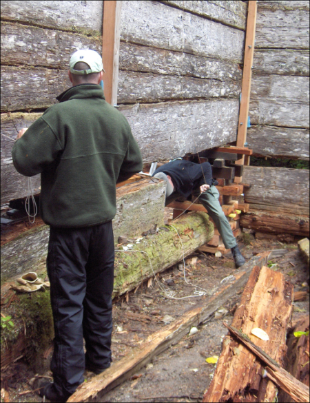 As Dr. Kennedy previewed in 2005, "This stabilization work will be completed in the Summer of 2006 by students enrolled in the University of Oregon's School of Architecture and Allied Arts' Pacific Northwest Preservation Field School." They certainly deserve our thanks and congratulations. The photos of the 2006 restoration work were provided by Tamara from a disk that the university sent to her. The 2007 photos are from the tour of the cabin that I took with Tamara and her group.
